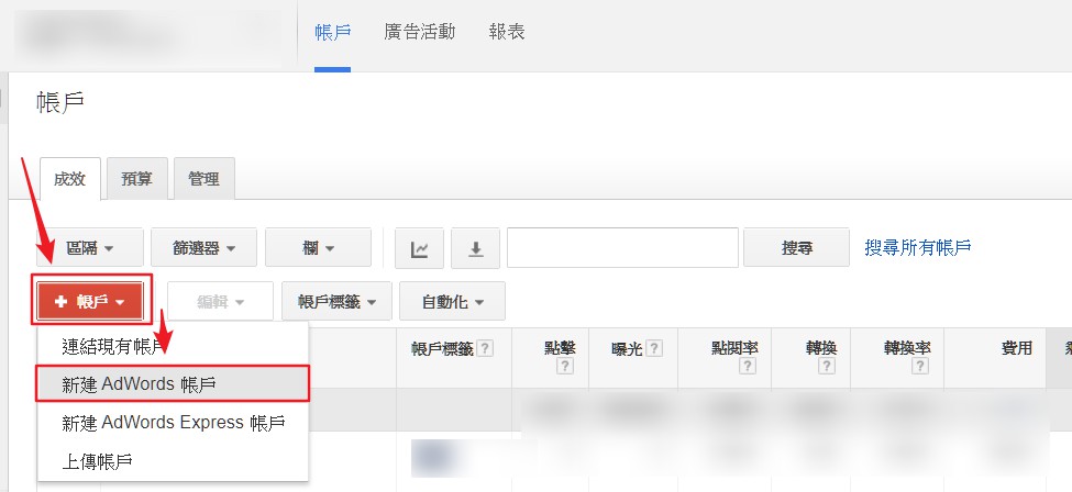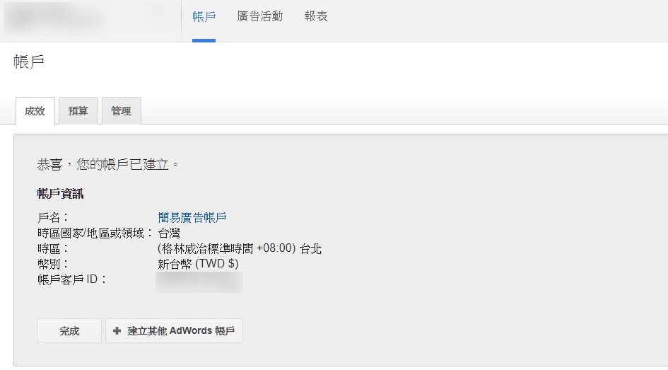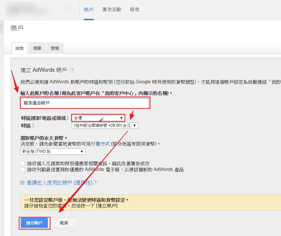 這邊我們選擇「新建Adwords帳戶」,然後填入基本資料並按「建立帳戶」。